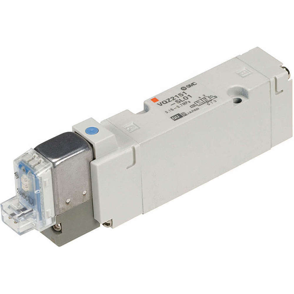 <p>Series VQZ base mount solenoid valves combine convenience with durability and performance in a more traditional mounting style. Series VQZ Body Ported Solenoid Valves combine flexibility with high performance and long life in an inline body style. <ul><li>Fluid: air, inert gas</li><li>Operating pressure range: 0.1 - 0.7MPa</li><li>Effective area mm<sup> 2</sup> (Cv):<br>metal seal 2.0 (0.11) - 12.6 (0.7);<br>rubber seal 3.1 (0.17) - 16.2 (0.9)</li><li>Coil rated voltage: 12, 24VDC;<br>100, 110, 200, 220VAC</li><li>Response time (ms) standard 1W, high pressure 1.5W:<br>metal seal 25 or less; rubber seal 30 or less</li><li>Ambient and fluid temperature: -10 to 50 C</li></ul><br /></p>