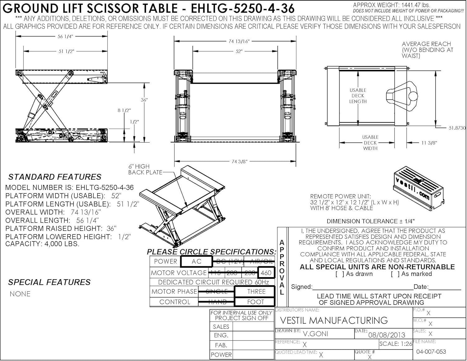 Overall Size W x L x H (lowered): 74 x 56 x 8" Wt. (lbs.): 1890 Platform W x L: 52 x 50" Cap. (lbs.): 4000 Lowered Hgt.: 1/2" Raised Height: 36"