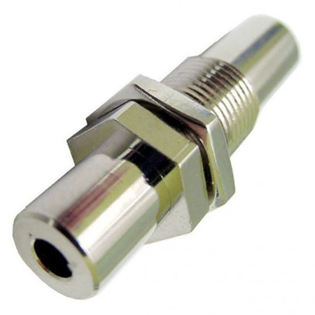 30-295-HEX | 3.5MM STEREO HEX NUT PANEL MOUNT FEED THRU 3.5mm stereo Female to Female hex nut feed thru. Audio or infrared signal Jack. Mounts in 3/8" hole. Overall length 1.43". Nickel Plated, threaded body.