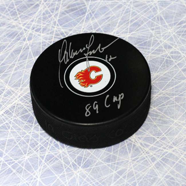 Autograph Authentic LOOH13205B Hakan Loob Calgary Flames Autographed Hockey Puck with 1989 Cup Note