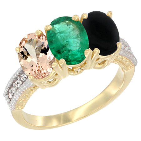 10K Yellow Gold Natural Morganite, Emerald & Black Onyx Ring 3-Stone Oval 7x5 mm, sizes 5 - 10