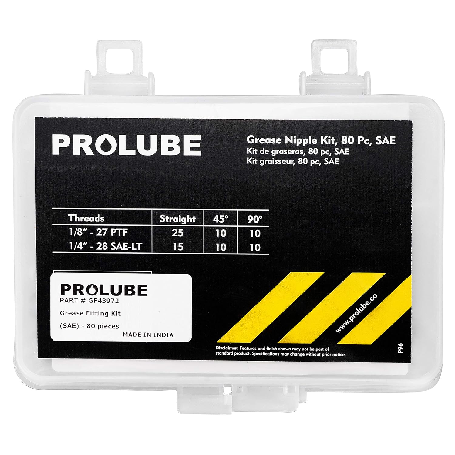 PROLUBE 43972 Grease Fitting Set contains 80 grease fittings of three different sizes. All fittings are manufactured under the most stringent of quality standards, and are heat treated to ensure long-lasting life. All contents come in a sturdy plastic box with individual trays for each fitting. Handy kit for a mechanic or someone doing heavy maintenance.
