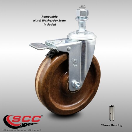 Stainless Steel High Temp Phenolic Swivel Threaded Stem Caster w/5" x 1.25" Brown Wheel and 1/2" Stem & Total Locking Brake - 300 lbs Capacity/Caster - Service Caster Brand