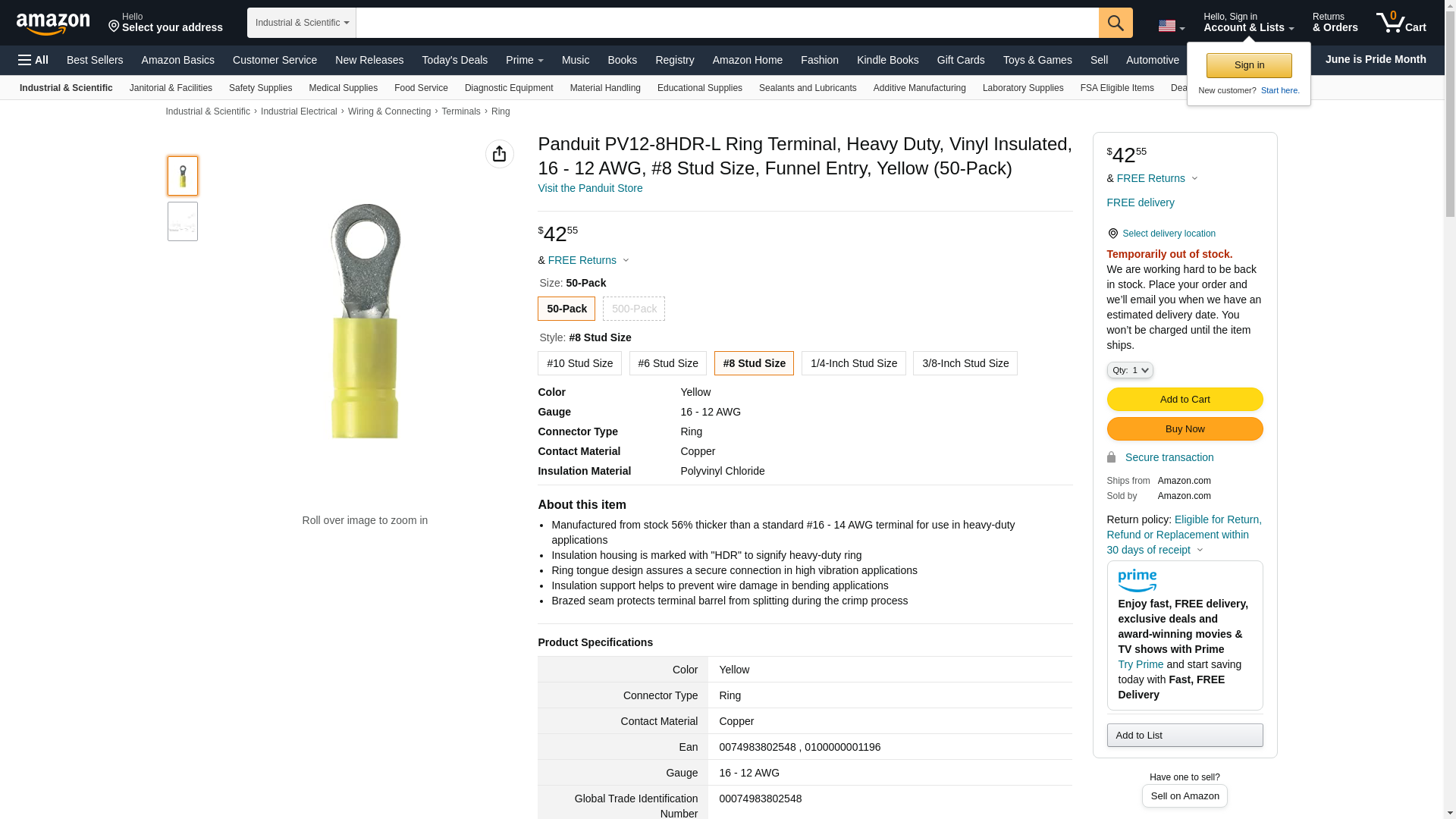 Panduit PV12-8HDR-L Ring Terminal, Heavy Duty, Vinyl Insulated, 16 - 12 AWG, #8 Stud Size, Funnel Entry, Yellow (50-Pack)