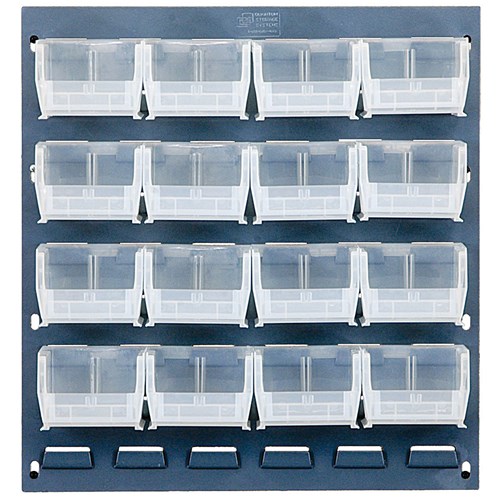The QLP-1819-220-16CL Clear-VIEW Louvered panel is a complete storage system comprising a Louvered panel with ready-to-use Clear storage bins. The panel is easily mounted to the surface of your choosing and the bins are, in turn, easily applied to the Louvered wall. The bins are made with slotted label holders and a recessed handle makes for easy use. Outer Dimensions: 18"L x 19"H. Bin Dimensions: 7.37" x 4.12" x 3".