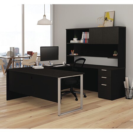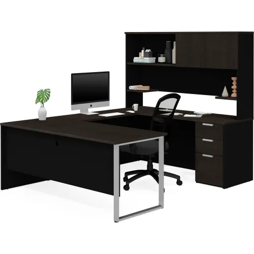 Bestar Pro-Concept Plus U-Shaped Executive Desk with Pedestal and Hutch, Deep Grey & Black