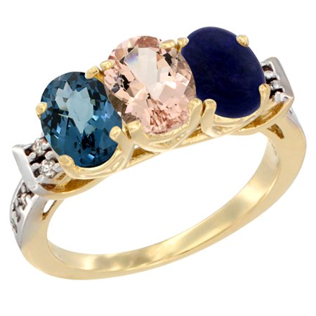 10K Yellow Gold Natural London Blue Topaz, Morganite & Lapis Ring 3-Stone Oval 7x5 mm Diamond Accent, sizes 5 - 10