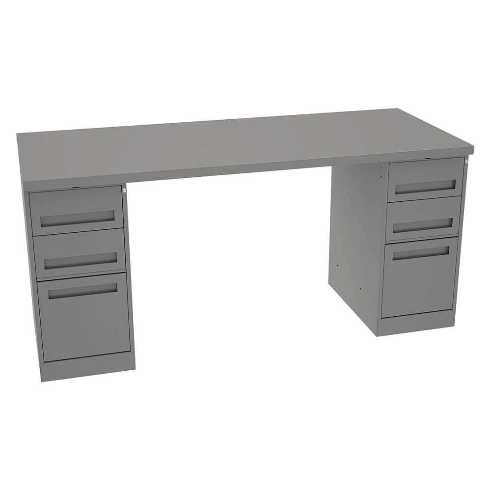 | Feature | <b>Price For:</b> Each <b>Finish</b>: Powder Coated <b>Workbench/Table Frame Material</b>: Steel <b>Workbench/Workstation Item</b>: Workbench <b>Includes</b>: Top, Leg, (3) Drawer Units <b>Workbench/Table Assembly</b>: Unassembled <b>Height</b>: 33-1/2" <b>Top Thickness</b>: 1-1/2" <b>Color</b>: Gray <b>Edge Type</b>: Straight <b>Depth</b>: 30" <b>Workbench/Table Leg Type</b>: Pedestal <b>Workbench/Table Surface Material</b>: Steel <b>Load Capacity</b>: 1800 lb. |