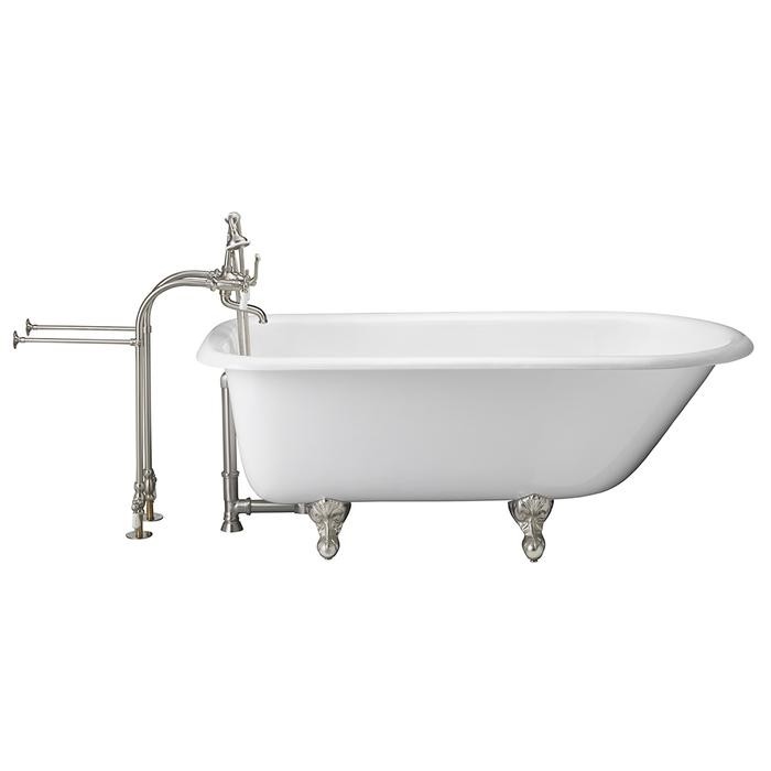 - Kit includes 55 1/2" Cast Iron Tub, Tub Filler, Tub Supplies and Tub Drain; Porcelain lever handles are 1/4 turn with ceramic disc cartridges; Telephone style hand shower includes cradle and 60" hose; Freestanding bath supplies are 30" high with stops and supports; Tub drain has twist and lift stopper