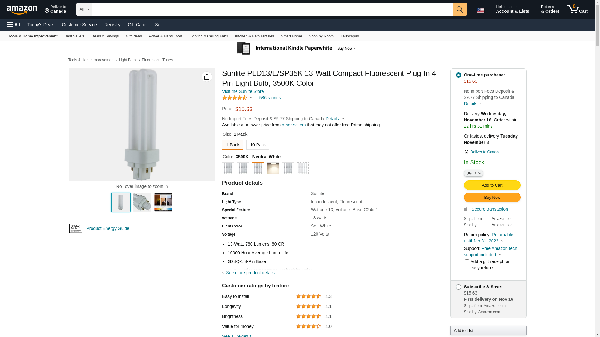 Sunlite PLD13/E/SP35K 13-Watt Compact Fluorescent Plug-In 4-Pin Light Bulb, 3500K Color. 13-Watt, 780 Lumens, 80 CRI....
