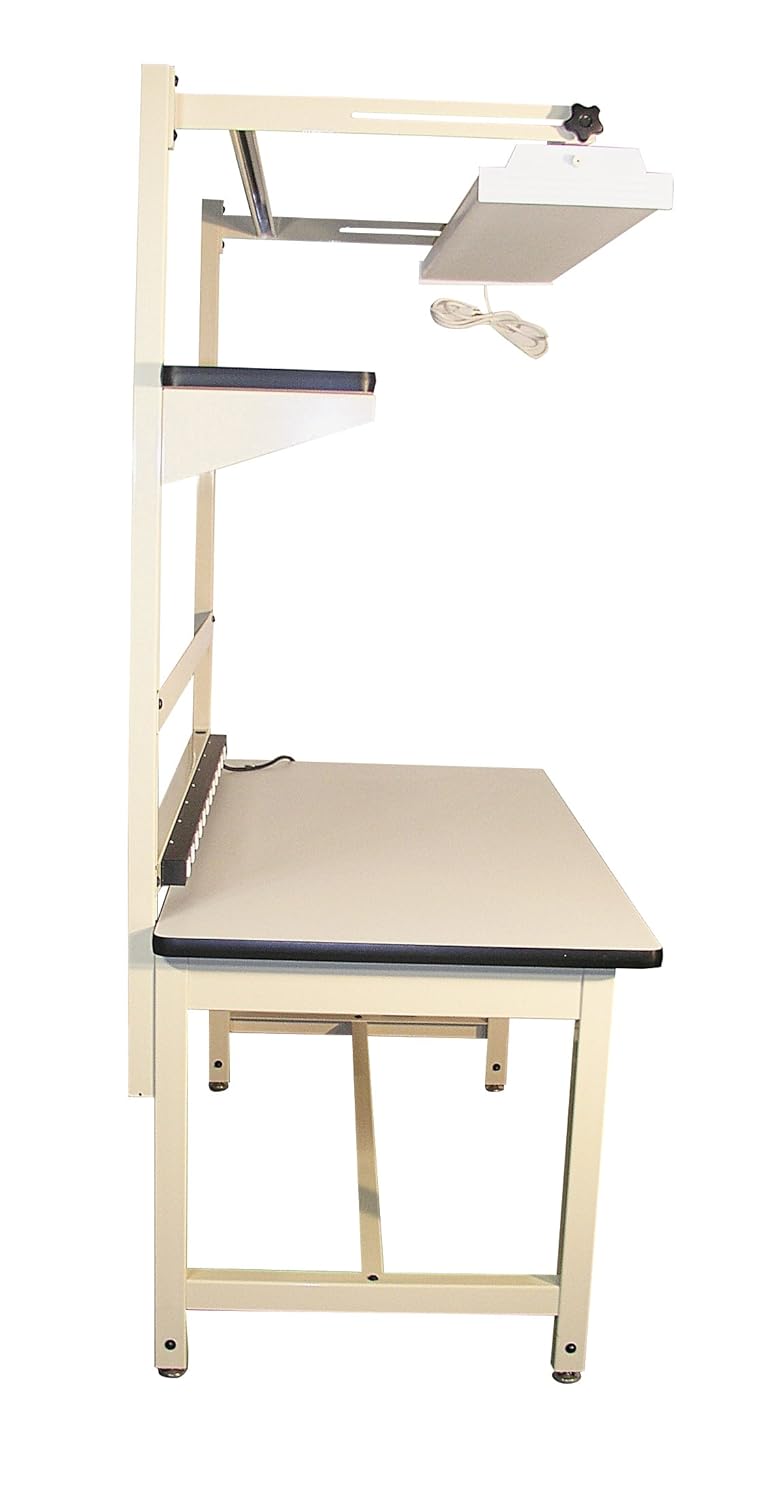 Bench in a Box 2 includes 60" L x 30" D x 30" to 36" H base bench, footrest, 6" drawer with lock, 12 outlet power supply, overhead adjustable light, 12" x 60" laminate shelf, bin holder and standard ground kit. White ESD laminate with "T" mold edging and light beige frame.</p>