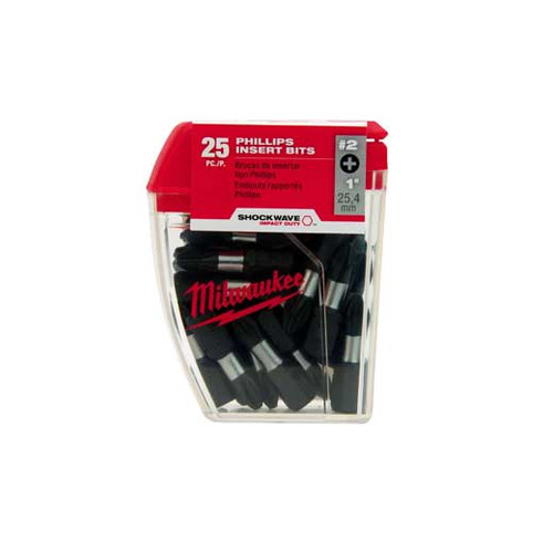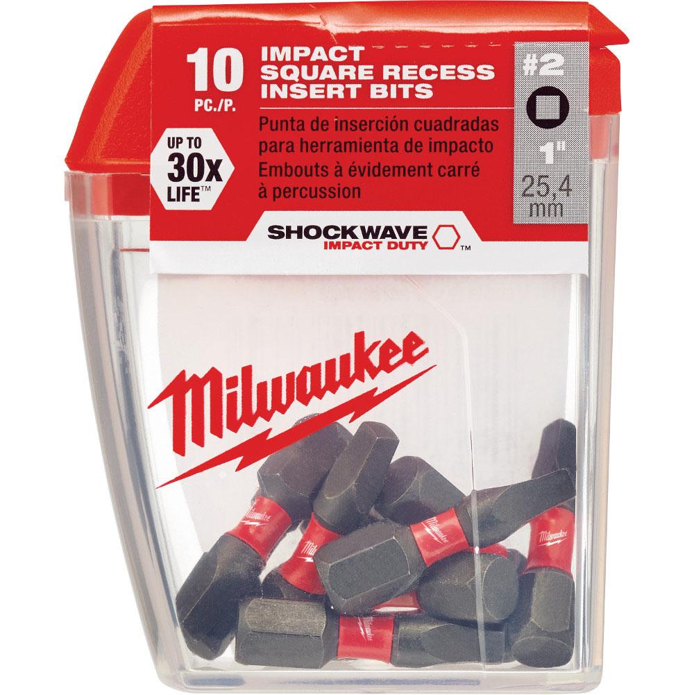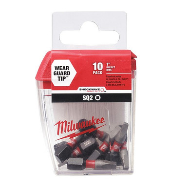#2 Square Recess Shockwave 1" Insert Bit Contractor (Package of 10) Milwaukee shockwave impact duty driver bits are engineered for extreme durability and up to 10x life. Made from proprietary steel and heat treated to control hardness, the shockwave impact duty driver bits feature an innovatively designed geometric shock absorption zone to extend life. The forged tip allows for a secure grip and maximum contact eliminating stripping or slipping. Broadly targeting cordless users, the shockwave impact duty accessory line is not only ideal for heavy duty impact applications, but delivers a full system solution for all the user's drilling and fastening needs. 2 per package. Features: #2 Square Recess 1/4" Diameter 1" Long Pack of 10 Since its founding in 1924, Milwaukee has focused on a single vision: To produce the best heavy-duty electric power tools and accessories available to the professional user. Today, the Milwaukee name stands for the highest quality, durable and reliable professional tools money can buy.