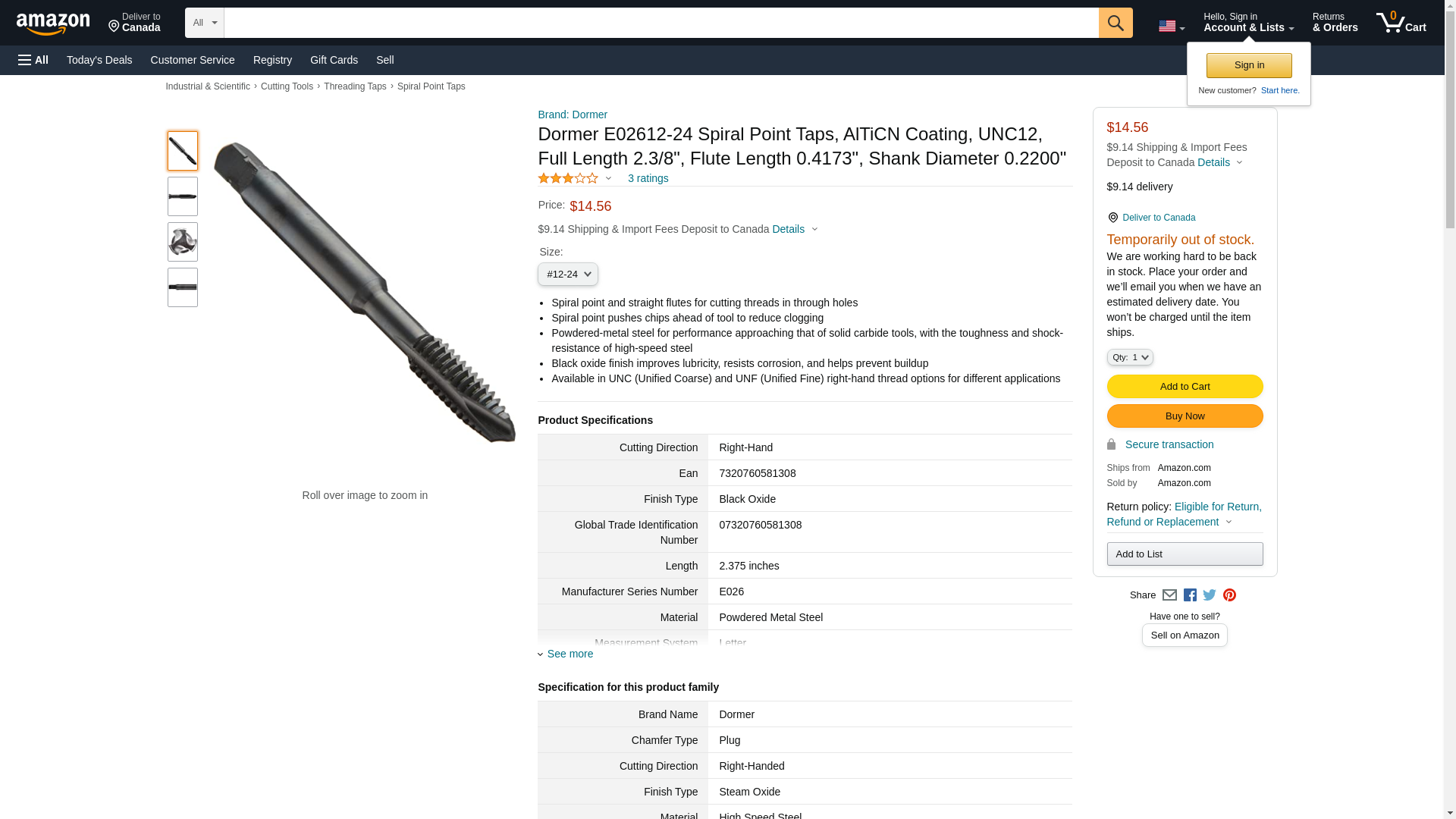 Dormer E02612-24 0581308 UNC Machine Tap Spiral Point No.12 x 24 - MROSupply.com