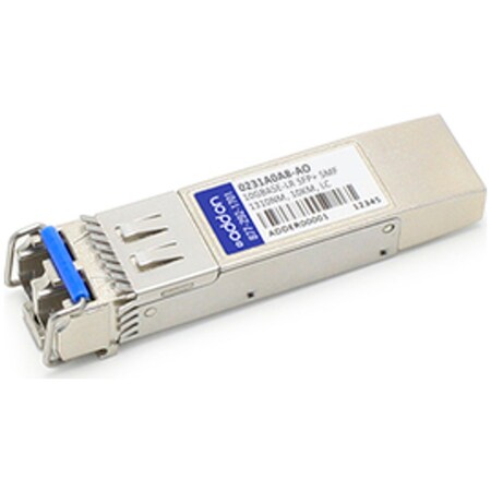 Manufacturer: ADDON<br> Part: 0231A0A8-AO<br> UPC: 821455599884<br> Category: Networking - Transceivers & Multiplexers - Tranceivers &<br> Tranceiver Modules<br> Description: AddOn<br> AddOn - SFP+ transceiver module (equivalent to: HP 0231A0A8) - 10<br> Gigabit Ethernet - 10GBase-LR - LC single-mode - up to 6.2 miles - 1310<br> nm<br><br><br> Product Description AddOn - SFP+ transceiver module - 10 Gigabit<br> Ethernet<br> Device Type SFP+ transceiver module - LC single-mode<br> Form Factor Plug-in module<br> Cabling Type 10GBase-LR<br> Data Transfer Rate 10 Gbps<br> Optical Wave Length 1310 nm<br> Data Link Protocol 10 Gigabit Ethernet<br> Max Transfer Distance 6.2 miles<br> OEM Manufacturer Equivalent Part Number HP 0231A0A8<br> Manufacturer Warranty Limited lifetime warranty<br><br>Extended Specifications<br><br> General<br><br> Device Type SFP+ transceiver module<br> Form Factor Plug-in module<br> Networking<br><br> Connectivity Technology Wired<br> Cabling Type 10GBase-LR<br> Data Link Protocol 10 Gigabit Ethernet<br> Data Transfer Rate 10 Gbps<br> Optical Wave Length 1310 nm<br> Max Transfer Distance 6.2 miles<br> Features Digital Optical Monitoring (DOM) support<br> Expansion / Connectivity<br><br> Interfaces 1 x Ethernet 10GBase-LR - LC single-mode x 2<br> Miscellaneous<br><br> OEM Manufacturer Equivalent Part Number HP 0231A0A8<br> TAA Compliant Yes<br> Manufacturer Warranty<br><br> Service & Support Limited warranty - lifetime
