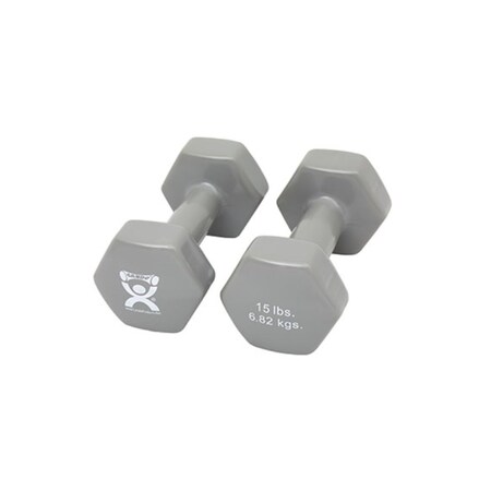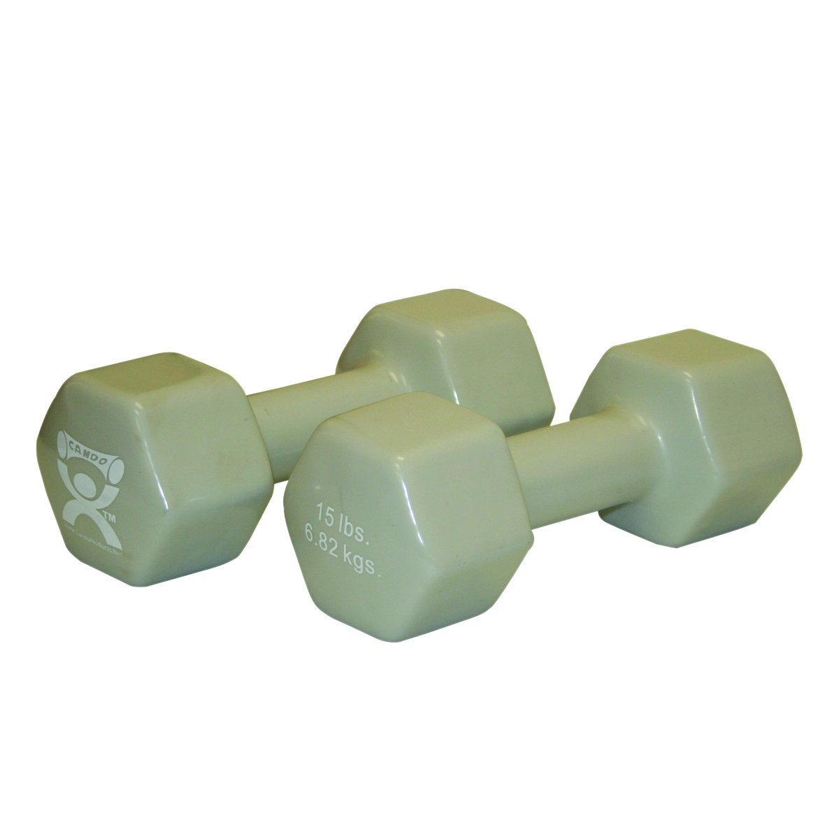 color-coded vinyl coated solid iron dumbbell, 15lb., pair Vinyl coated, color-coded cast iron dumbbells are ideal for upper body exercises, for physical therapy, or for light workouts. Vinyl coating gives weight a comfortable feel. 15 pounds, sold in a pair. Product photo may not exactly match the product offered for sale. Please refer to the product description.