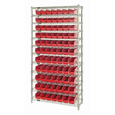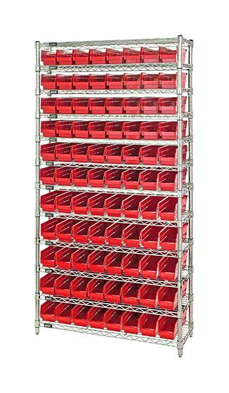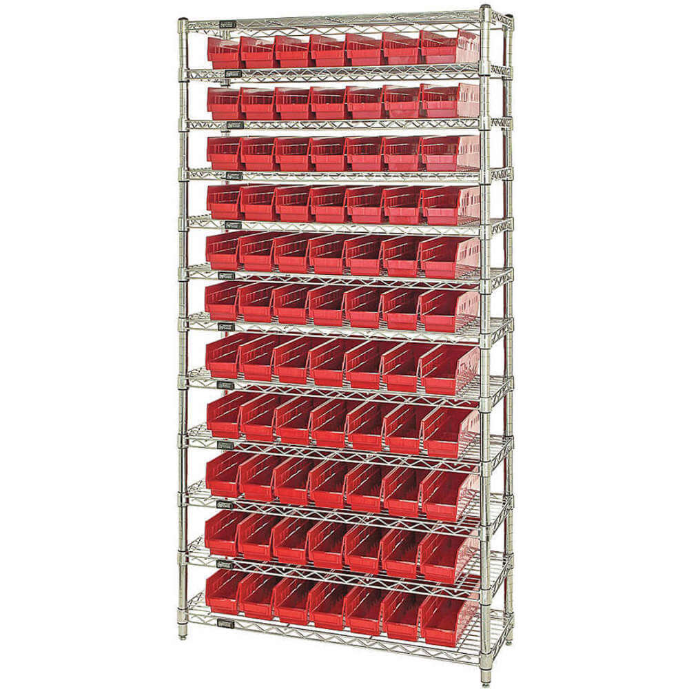 Quantum Storage Systems WR12-103RD 12-Tier Complete Wire Shelving System with 77 QSB103 Red Bins, Chrome Finish, 18" Width x 36" Length x 74" Height