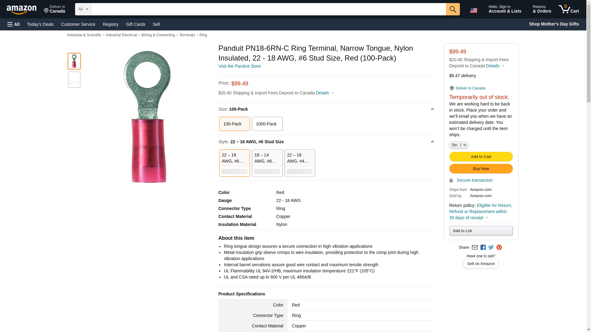 Panduit PN18-6RN-C Ring Terminal, Narrow Tongue, Nylon Insulated, 22 - 18 AWG, #6 Stud Size, Red (100-Pack)
