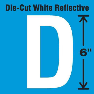 'Reflective Letter Label, Character D, Character Height 6 In., Character Width 3-3/8 In., Color Reflective White, Material Vinyl, Overall Height 6 In., Overall Width 3-3/8 In.'