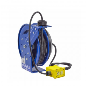 - Spring-driven enclosed power cord reel with incandescent cage light and 75' of #16 AWG cable