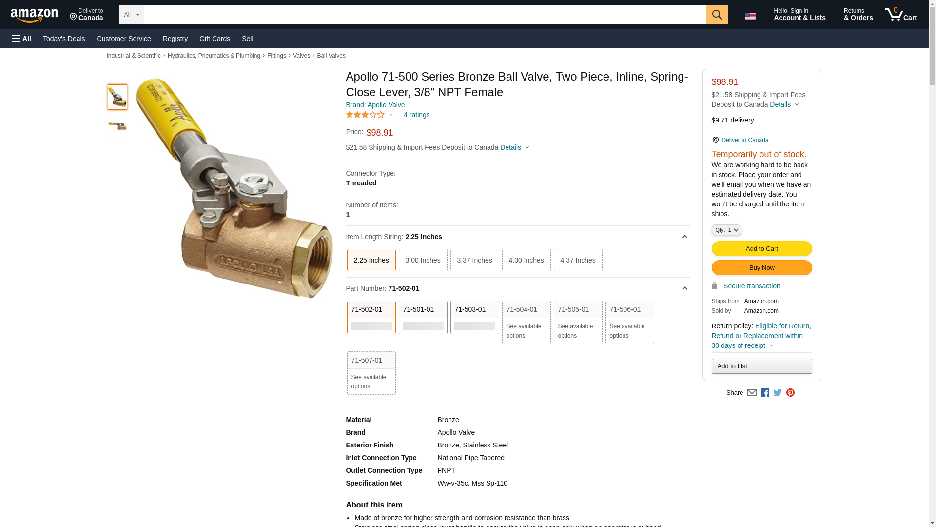 Apollo 71-500 Series Bronze Ball Valve, Two Piece, Inline, Spring-Close Lever, 3/8" NPT Female