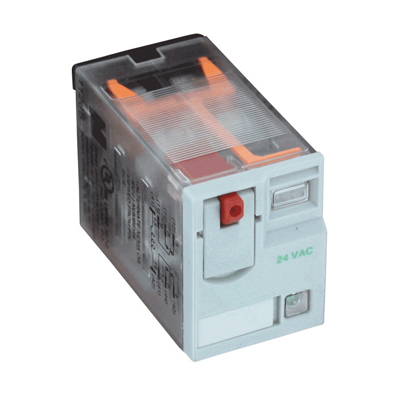 The Series 782 Electromechanical Ice Cube Relay is a full-featured DPDT relay that can be used to switch two different devices with a single trigger. With a ratting of 15 amps, the relay can be used to stop and start small fans, motors, and pumps directly. It features a flag status indicator and a LED status lamp to let the user know when the relay is activated. In order to differentiate between AC and DC actuated models the push-to-test button is color-coded. For testing the operation, a removable lock-down lever holds the test button in place. The clear plastic housing gives a view of the contacts, and there is a removable I.D. tag for labeling the circuit.