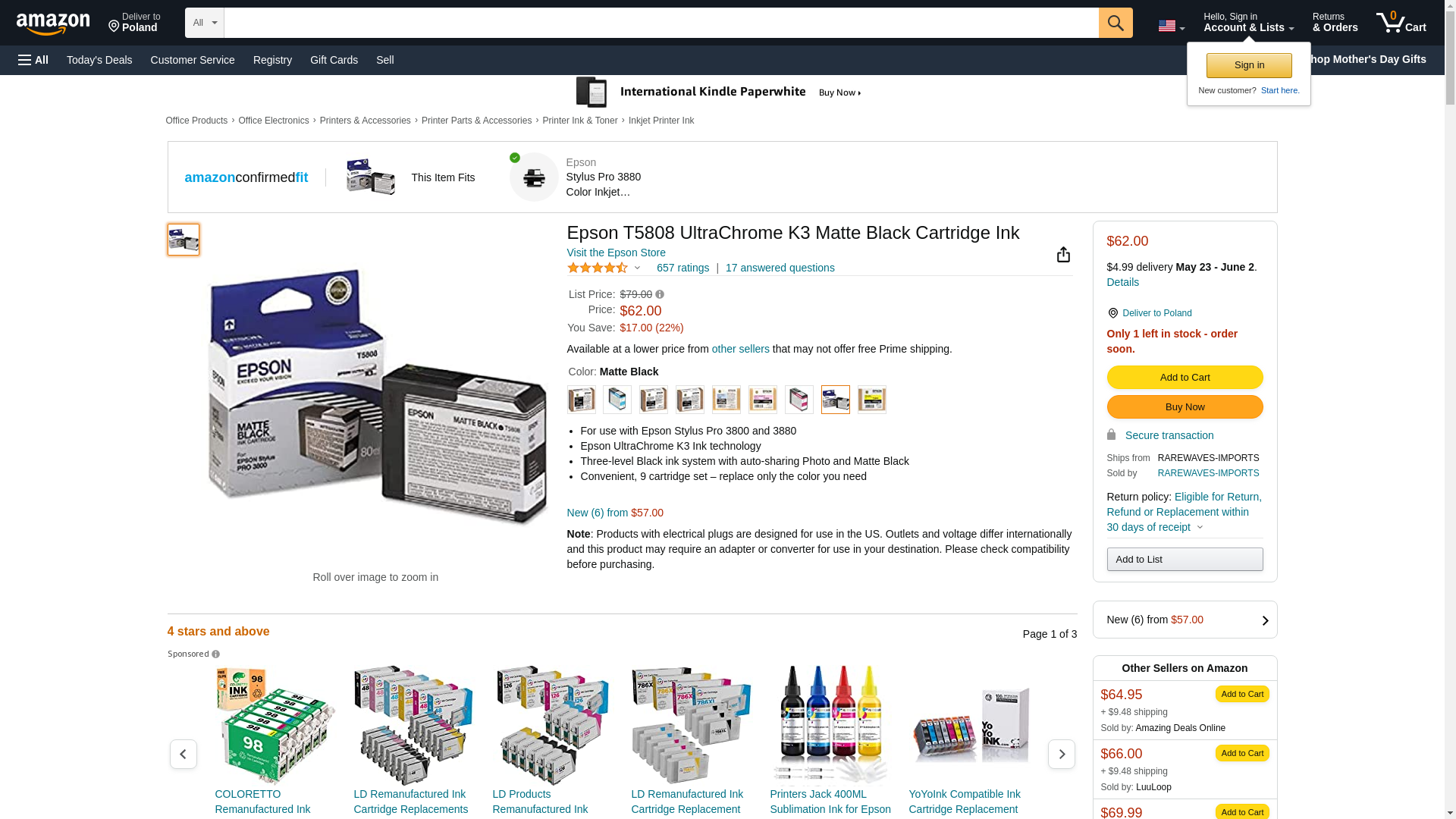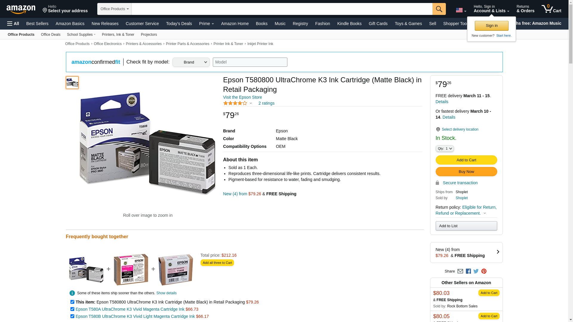 Epson T580800 UltraChrome K3 Ink Cartridge (Matte Black) in Retail Packaging