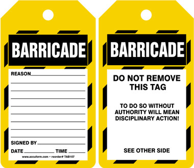 Order TAB107PTM by Accuform Barricade Status Safety Tag "Barricade" - US Mega Store