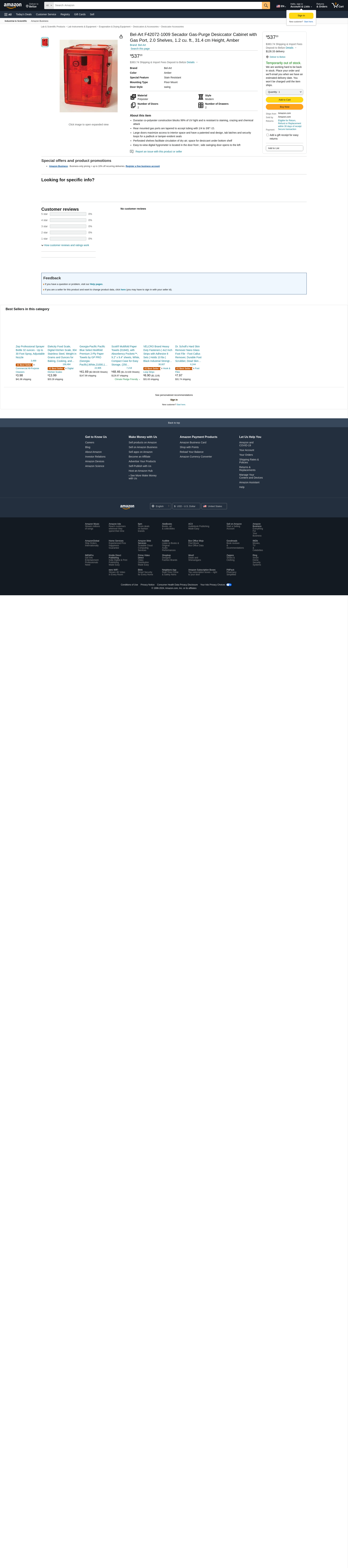 Bel-Art F42072-1009 Secador Gas-Purge Desiccator Cabinet with Gas Port, 2.0 Shelves, 1.2 cu. ft, 31.4 cm Height, Amber