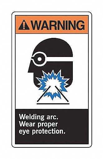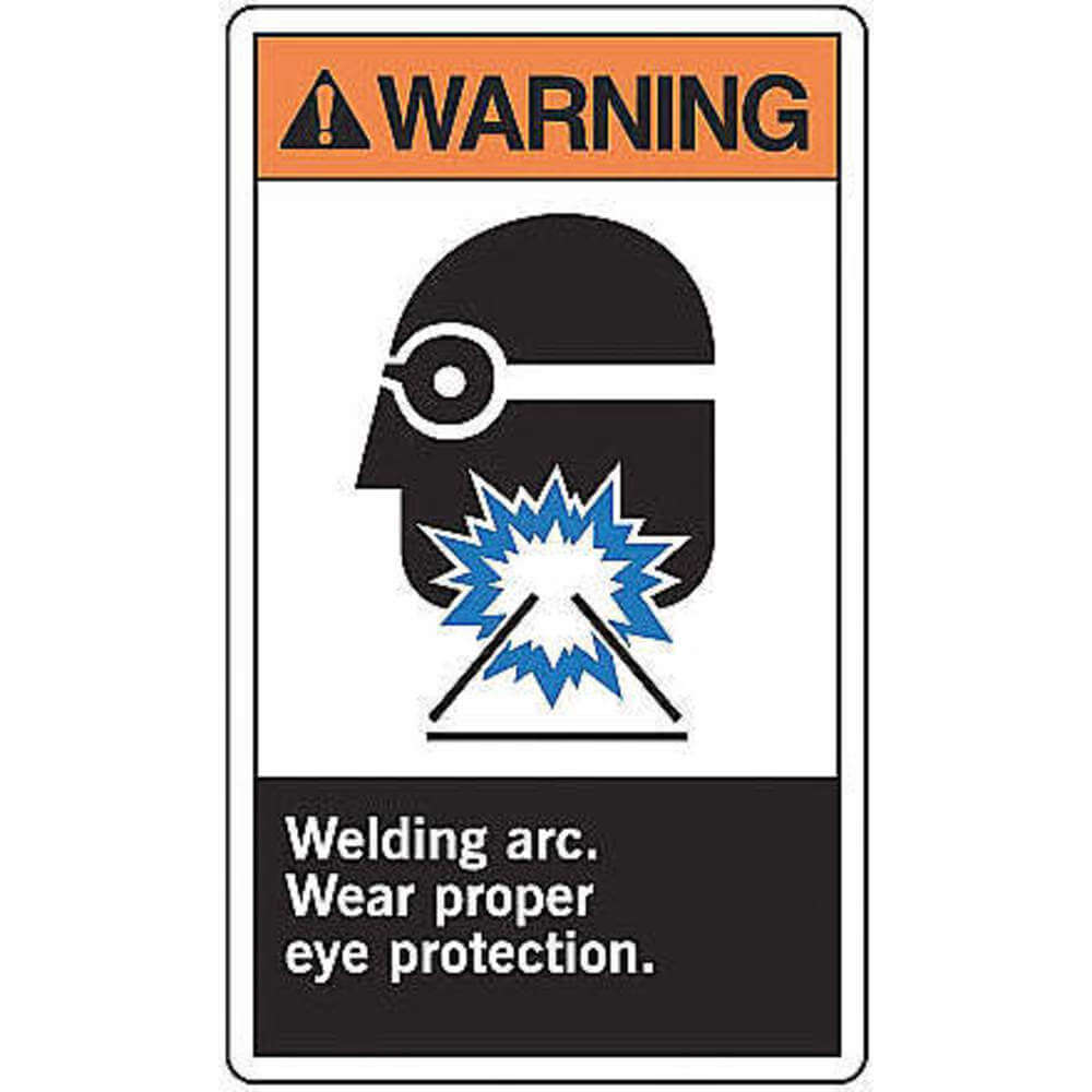 - <b>Price For:</b> Each <b>Subject Matter</b>: Personal Protection <b>Language</b>: English <b>Legend</b>: Welding Arc Wear Proper Eye Protection <b>Shape</b>: Rectangle <b>Legend/Background Color</b>: Black/White <b>Self-Adhesive</b>: Yes <b>Width</b>: 3-1/2" <b>Header Background Color</b>: Orange <b>Material</b>: Vinyl <b>Header Legend Color</b>: Black <b>Item</b>: LABEL <b>Metal Detectable</b>: No <b>Height</b>: 5" <b>Legend Style</b>: Text and Symbol