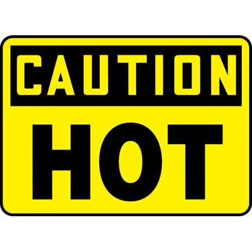 10" x 14" Adhesive Vinyl OSHA Sign with Legend: "Caution Hot" Inform workers that there is hot material or equipment in the work environment. Adhesive Vinyl (VS) Self-stick custom signs. Adhesive Vinyl is a moisture-resistant custom sign material that adheres to almost any flat surface. Adhesive vinyl signs will work for short term outdoor applications, and in moderate temperatures.
