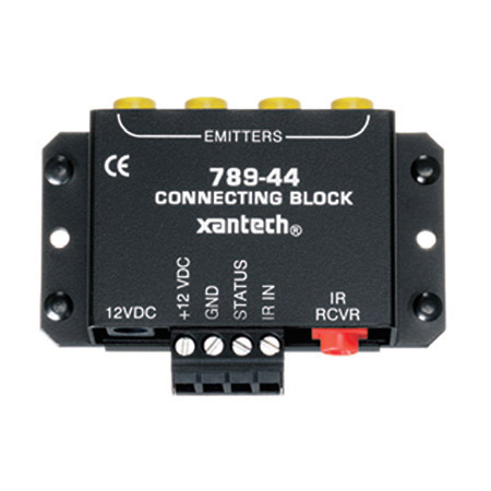 XANTECH 789-44PS/RP 1-ZONE CONNECTING BLOCK (WITH POWER SUPPLY) CONNECTS 4 EMITTER PORTS & POWER SUPPLY TO ALL XANTECH IR RECEIVERS & KEYPADS; 4 PARALLEL EMITTER PORTS WITH 470W RESISTORS DRIVE 4 SINGLE OR 4 DUAL EMITTERS ; QUICK-CONNECT STEREO MINI JACK FOR XANTECH(TM) IR RECEIVERS THAT USE A STEREO MINI PLUG; STATUS TERMINAL FOR CONNECTION OF XANTECH(TM) IR RECEIVERS & KEYPADS WITH STATUS INDICATOR LEDS; 2.1MM COAXIAL POWER JACK; INCLUDES XAN781RG POWER SUPPLY; DIM: 1.75"H X .3"W X .81"D