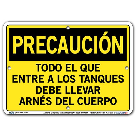 Vestil Caution Sign SI-C-80-A-AC-130-S Aluminum Composite .130" Overall Size 10.5"W x 7.5"H Anyone Entering Tanks Must WEAR Body Harness, TODO EL QUE Entre A Los TANQUES Debe LLEVAR ARNÉS DEL Cuerpo