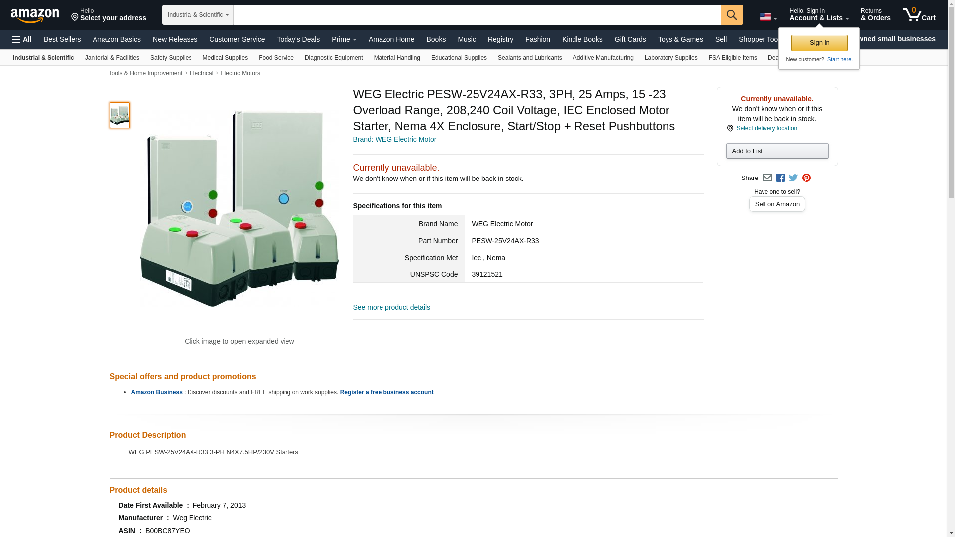 WEG Electric PESW-25V24AX-R33, 3PH, 25 Amps, 15 -23 Overload Range, 208,240 Coil Voltage, IEC Enclosed Motor Starter, Nema 4X Enclosure, Start/Stop + Reset Pushbuttons