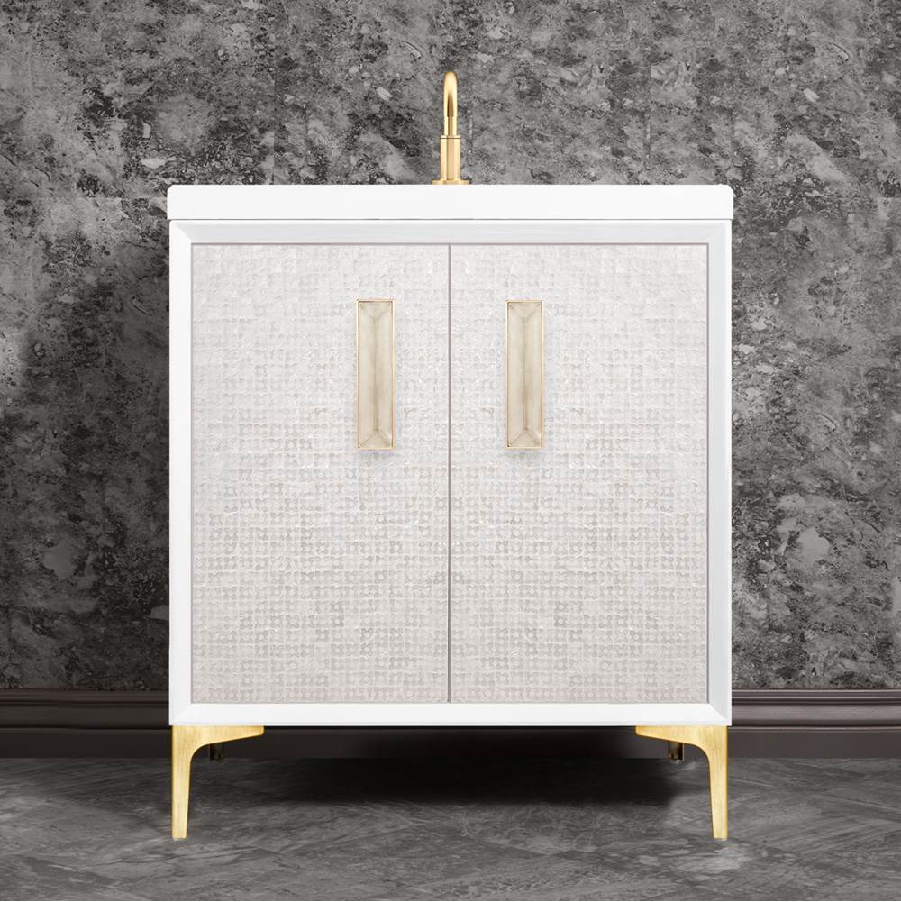Linkasink - VAN30W-016SB-BRS - MOTHER OF PEARL with 8'' Artisan Glass Prism Hardware 30'' Wide Vanity, White, Satin Brass Hardware, 30'' x 22'' x 33.5'' (without vanity top)