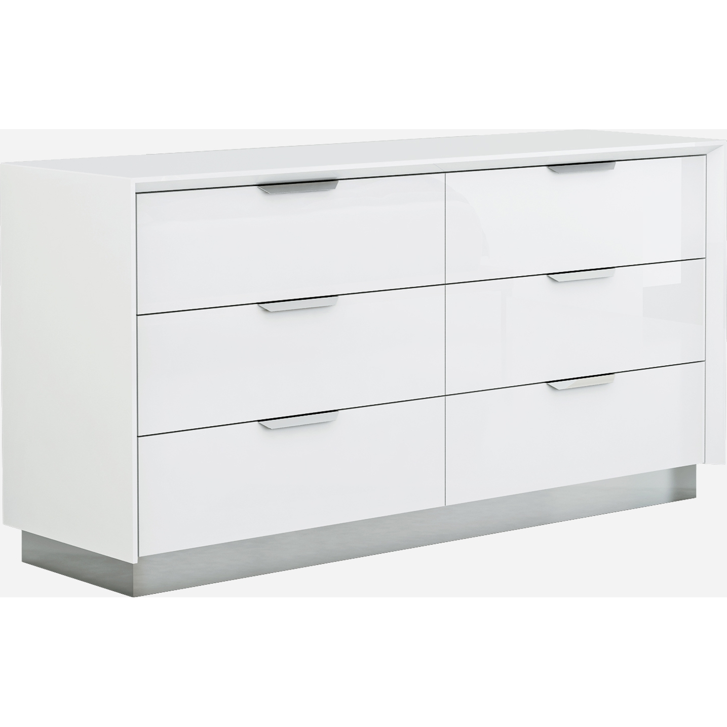 Navi Collection DR1354-WHT 63" Dresser with 6 Self Closing Drawers, Stainless Steel Trim Base, Stainless Steel Handles and High Gloss Medium-Density Fiberboard (MDF) Material in White Finish