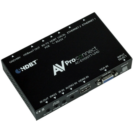 The <strong>AC-EX100TT-UHD-T</strong> is their 100m HDMI/VGA Transmitter via HDBaseT, This Tx has control input for RS-232, IR, Ethernet, and also comes with Audio Extraction and EDID Management.</p><p>AVPro Edge's auto-switching HDBaseT Table Top transmitter is a dual input VGA & HDMI auto sensing HDBaseT (over single CAT5e or better) Transmitter. Simplify installations in schools, offices, meeting rooms and huddle rooms. Once integrated into your client's system he now has the perfect solution for sharing information from any computer or source. This unit is designed to work flawlessly with all PC, VESA and traditional resolutions 4K 60Hz 4:2:0 8-bit & HDR 4:2:2 12 BIT. VGA supports DCI 2K, 1080P, 1920x1200x60. In addition to its compact and robust design, it transmits the digital signal up to 100 meters (328?) giving you ultimate flexibility, especially in large rooms like libraries or auditorium style rooms/classrooms. AVPro Edge's Military grade performance insures system stability for years to come.</p><p><strong>Key Benefits Include:</strong></p><p>1) Ultra High Definition: The length of manufactured HDMI cable is unchangeable after it is made and they are unreliable after about 25FT. Additionally, HDMI connectors can only be terminated in specialized factory environment due to its extremely high frequencies and high density. This does not allow installers or users to remake or make cables on a DIY basis. CAT-5E/6A cables are available widely and can be reworked easily by the installer or end-user. Our AC-EX100TT-UHD-T supports 4K up to 70M (230ft) with crystal clear 4K Resolution & 100M (330ft) on 1080P.</p><p>2) Distance: By using AC-EX100TT-UHD-T, the transmission distance for HD 1080P is 100 meters (330ft) & 4K is up to 70 meters (230ft).</p><p>3) Auto Sensing: This transmitter is designed to be a "Set it & forget it" piece of hardware. When the user plugs in their device (BYOD), the Table Top Transmitter automatically senses the signal and makes it active. If both inputs are in use, there is a simple button on the front to toggle inputs.</p><p>4) Control: IR & RS-232 allow control of a rack or standalone projector or display.</p><p>5) Power: No local power required when you use the AC-EX100-UHD-R2. Power is provided by ultra-stable ieee PoE technology. Optionally you can power it locally for use with any HDBaseT Receiver.</p><p>6) RS232 Control: You can control switching and EDID using RS232 control of the local device.</p><p><strong>Please note:</strong> Receiver is not included.</p>