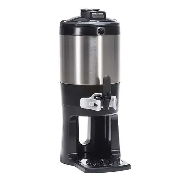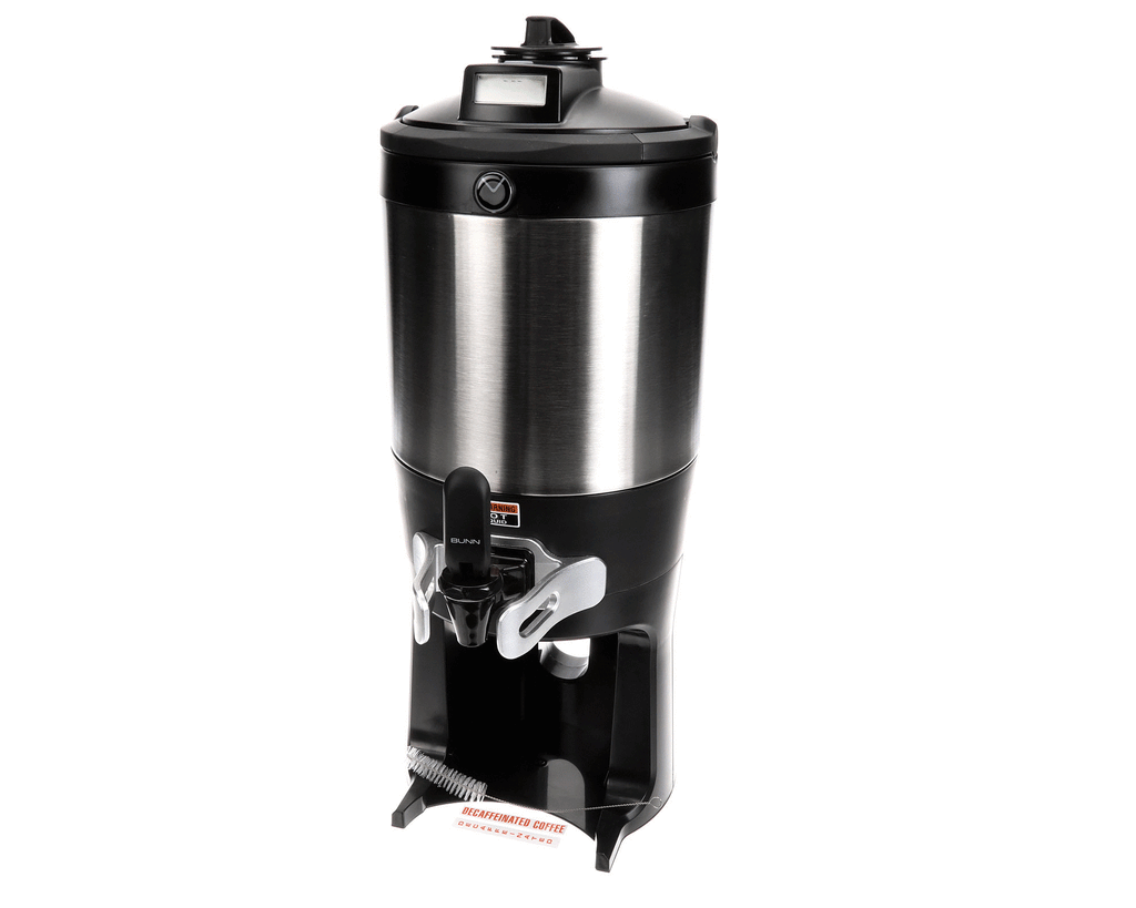 The newly restyled ThermoFresh® server line delivers hours of heat retention is ideal for self-service environments like convenience stores offices lounges and hotel breakfast bars and enhances operational convenience wherever it is used.Model #: 42750.0200Four-hour digital count-up timerVacuum insulated to keep coffee hot for hoursDigital sight gauge operates on four easily replaceable AAA batteries with an average 1-year lifespan: display shows low battery symbol when replacement is neededDrip tray is easily removed for cleaning or to provide extra clearance for dispensing into pitchersBrew-through design with flip lid coverLarge cup clearance allows for dispensing into cups decanters and thermal carafesIdeal for use with Twin or Single Infusion Series BrewersSelf-locking stand allows for multiple brewing and serving optionsSturdy aluminum faucet guard keeps faucet area clean and protectedSoft-grip bail handle for easy transportationFast flow faucetVolume indicator displays how much coffee is left inside the serverUnique lid design allows the display to be forward rear facing