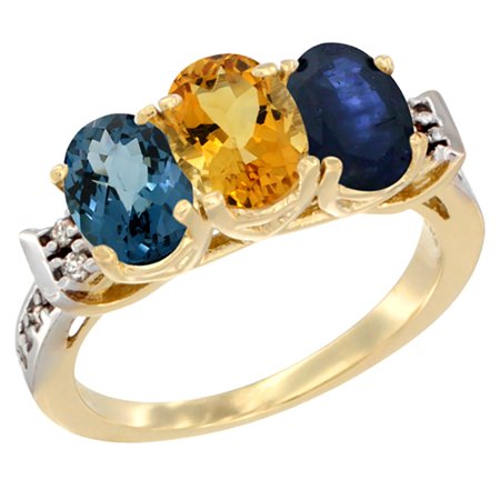10K Yellow Gold Natural London Blue Topaz, Citrine & Blue Sapphire Ring 3-Stone Oval 7x5 mm Diamond Accent, sizes 5 - 10