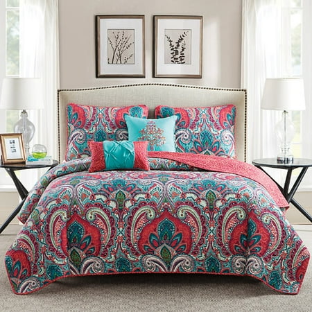 VQC3487 <br /> <b>Features</b> <br /> <ul> <li>100% Polyester</li> <li>Machine washable, gentle, tumble dry low</li> <li>Twin set includes 1 quilt, 1 sham and 2 decorative pillows</li> <li>Full/Queen and King sets include 1 quilt, 2 shams and 2 decorative pillows</li> <li>Product Type: Quilt/Coverlet set</li> <li>Style (Old): Contemporary</li> <li>Color: Red/Blue</li> <li>Pattern: Damask</li> <li>Material: Polyester</li> <li>Cleaning Method: Machine washable</li> </ul> <br /> <b>Dimensions</b> <br /> <ul> <li>Decorative pillows: 12" x 18" and 18" x 18"</li> <li>Overall Product Weight: 7 lbs</li> </ul>