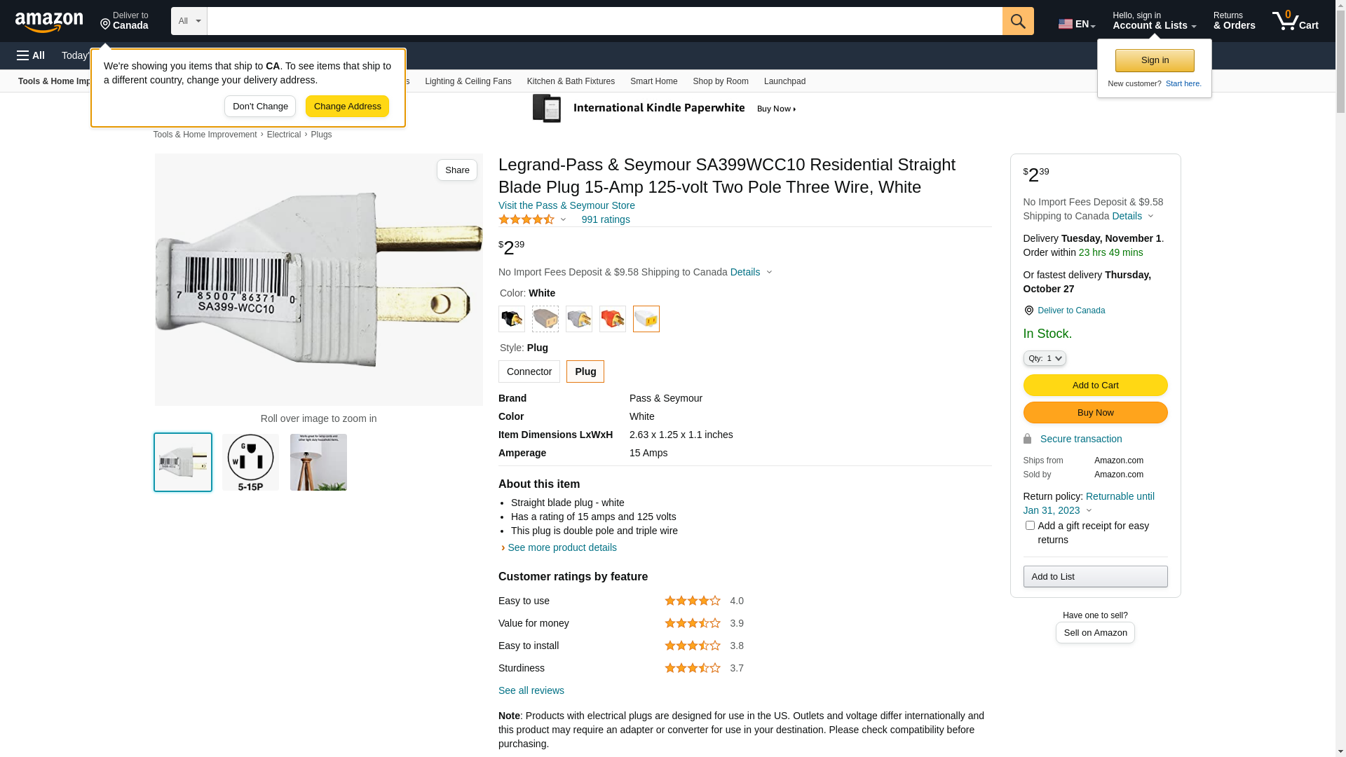 Legrand-Pass & Seymour SA399WCC10 Residential Straight Blade Plug 15-Amp 125-volt Two Pole Three Wire, White
