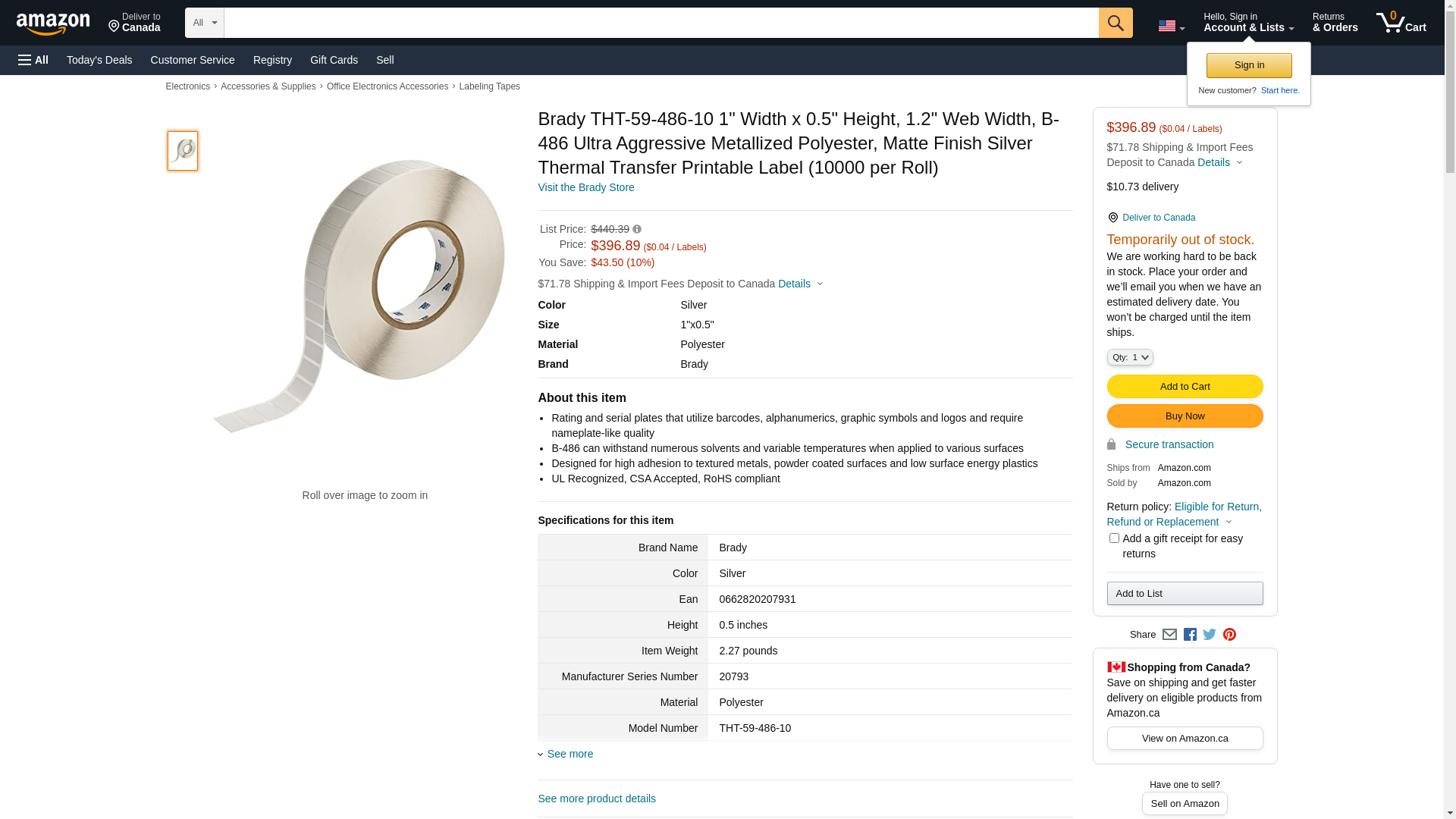 <p><strong>Brady, THT-59-486-10, 20793 0.5" x 1" Light Gray MetaLabel Metallized Matte Polyester Label</strong></p><p>Ultra Aggressive Metallized Polyester (B-486) is ideal for rating/serial plates that use barcodes, alphanumerics, graphic symbols and logos and require nameplate-like quality.</p><ul><li>Matte, light gray material has a permanent rubber-based adhesive and is thermal transfer printable</li><li>Designed for high adhesion to textured metals, powder coated surfaces and low energy plastics</li><li>RoHS compliant to 2005/618/EC MCV amendment to RoHS Directive 2002/95/EC; UL approved; CSA accepted</li><li>Service temperature of -40 to 248 Degree F (-40 to 120 Degree C)</li></ul>