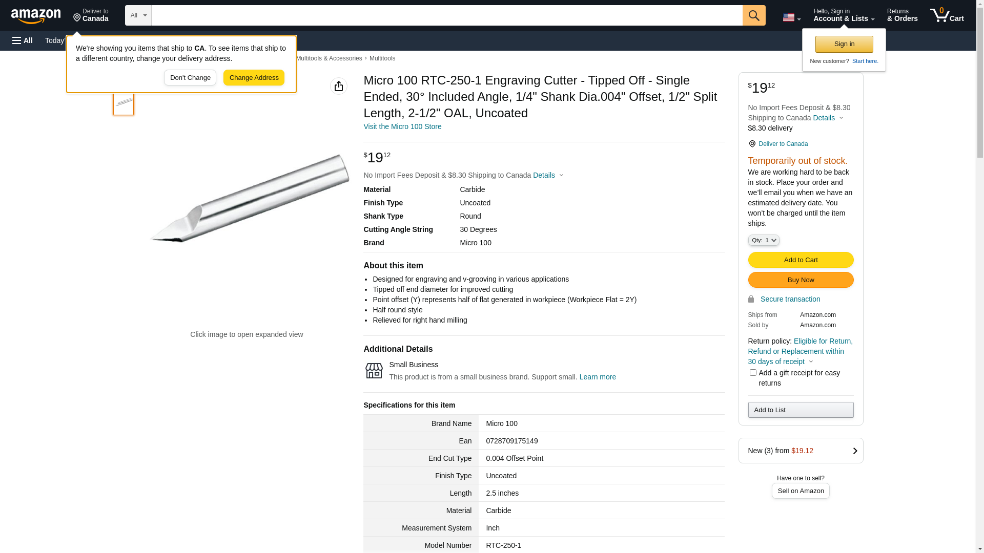 Micro 100 RTC-250-1 Engraving Cutter - Tipped Off - Single Ended, 30° Included Angle, 1/4" Shank Dia, 004" Offset, 1/2" Split Length, 2-1/2" OAL, Uncoated