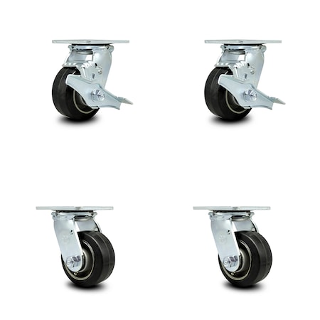 Rubber on Aluminum Swivel Top Plate Caster Set 4 w/4" x 2" Black Wheels-Includes 2 Swvl with Brakes and Bolt on Swvl Lcks&2 Swvl with Bolt on Swvl Lcks-1600 lbs Total Cpty-Service Caster Brand