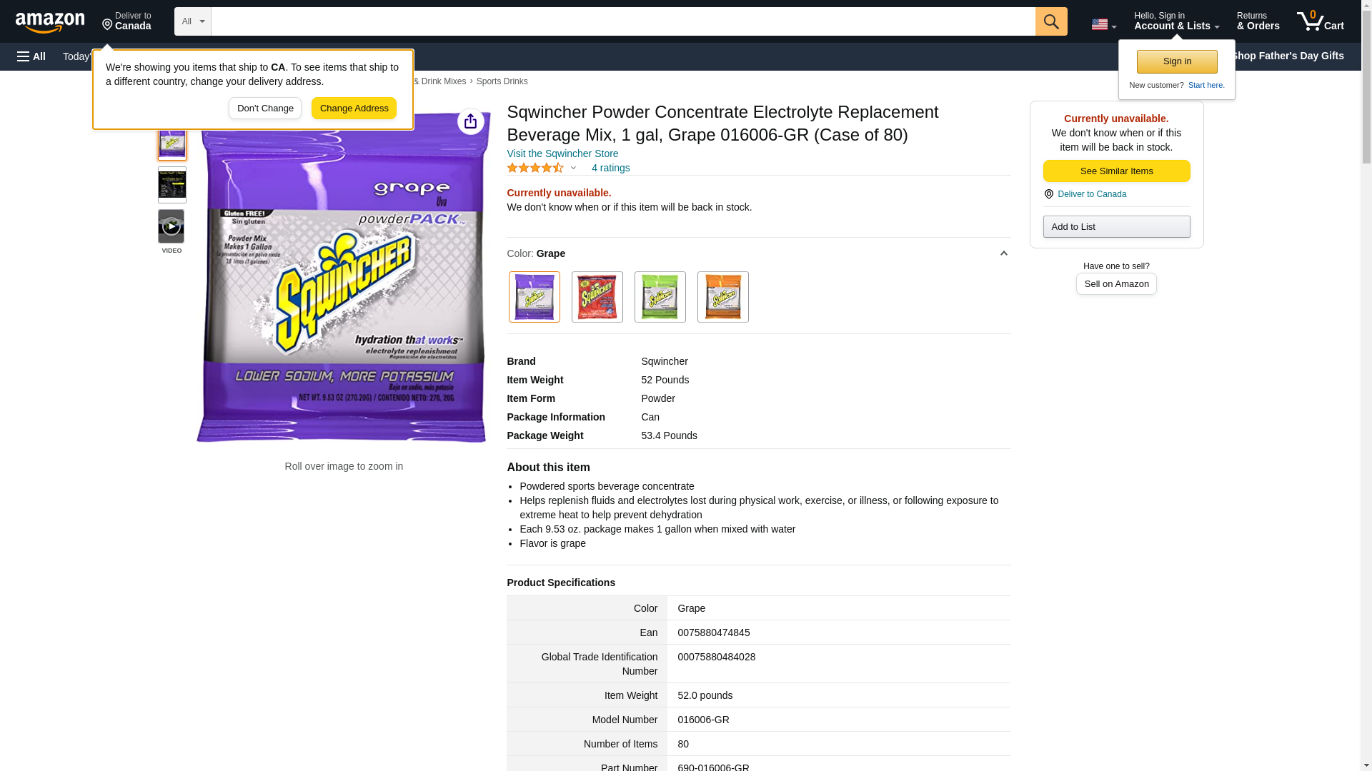 | Feature | Price For: Each Flavor: Grape Form: Powder Package Size: 9.5 oz. Yield: 1 gal. Item: Sports Drink Mix Country of Origin (subject to change): United States |