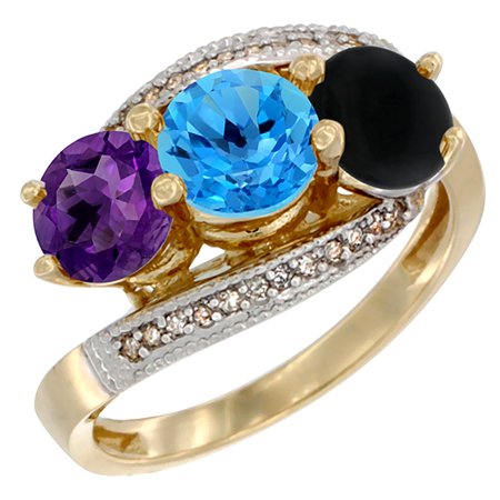 10K Yellow Gold Natural Amethyst, Swiss Blue Topaz & Black Onyx 3 stone Ring Round 6mm Diamond Accent, sizes 5 - 10
