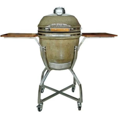 <br /> <b>Hanover 19" Ceramic Kamado Grill with Cart, Shelves and Accessory Package, Desert:</b> <ul> <li>19" Kamado Grill bundle includes a stainless steel cart, red oak side shelves and an accessory package</li> <li>Well insulated, high-efficiency grill for maximized moisture and flavor retention</li> <li>All-in-one unit: grill, bake, sear and smoke</li> <li>Wide temperature range: slow cooking 200 degrees F to high searing 700 degrees F temperatures</li> <li>Enlarged dome provides more room to cook large items or multi-level cooking surfaces</li> <li>Sealed dome construction provides more radiant heat and effective distribution of smoked flavor</li> <li>Extra thick ceramic construction and steel hardware for added strength and durability</li> <li>4 galvanized steel caster wheels for easy mobility</li> <li>2 dual-locking caster wheels (roll and pivot locking)</li> <li>Adjustable air flow for maximum heat control</li> <li>Features a temperature range of 200-700 degrees</li> <li>Maximum heat output: 1100 degrees F</li> <li>Cooking surface: 285 sq. in.</li> <li>Includes 2 cooking grates: 1 stainless steel and 1 cast iron fire grate</li> <li>Innovative design effectively removes flare-ups</li> <li>Maintains even temperatures for long periods of time</li> <li>Exterior remains cool during opperation</li> <li>Accessory package includes a cleaning tool, secondary half grid (for multi-level cooking), pizza stone and a durable vinyl cover that protects grill when not in use</li> </ul>
