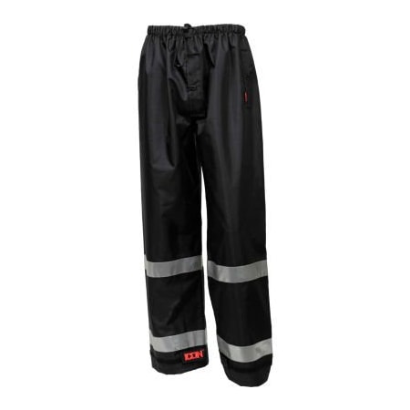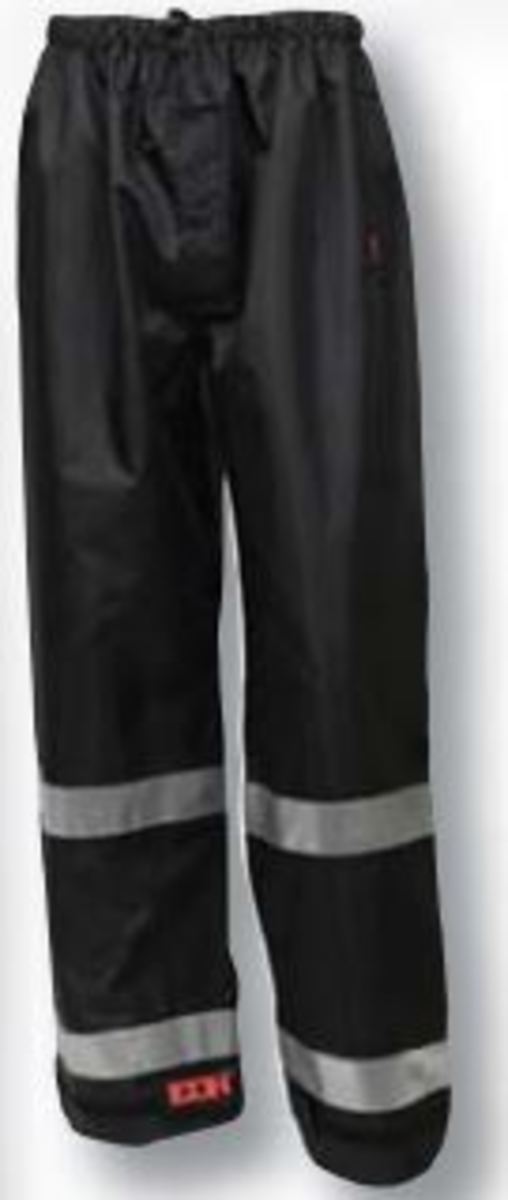 Black; waterproof, breathable polyurethane on 300 denier polyester; 360°, 2 inch silver reflective tape; stitched and taped sealed seams; elastic waist with adjustable drawcord; snap fly front; side openings with flap closure; hook & loop take-up straps on ankle cuffs; tested according to the ASTM E96 Standard for Water Vapor Breathability.