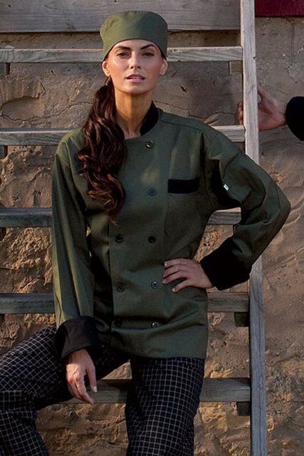 Uncommon Threads 0404-6504 Newport Chef Coat 10 Buttons in Olive/Black Trim - Large