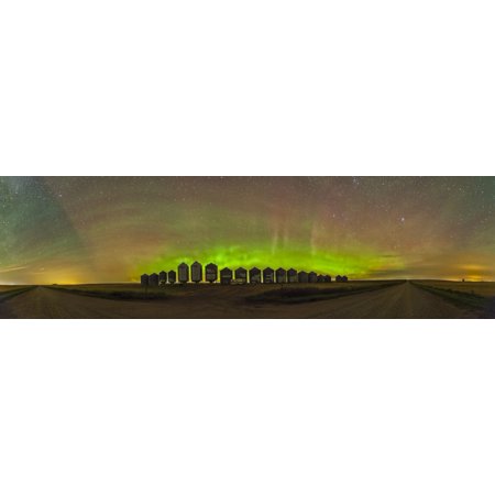 Aurora borealis behind grain bins on a country road in Alberta Canada Poster Print