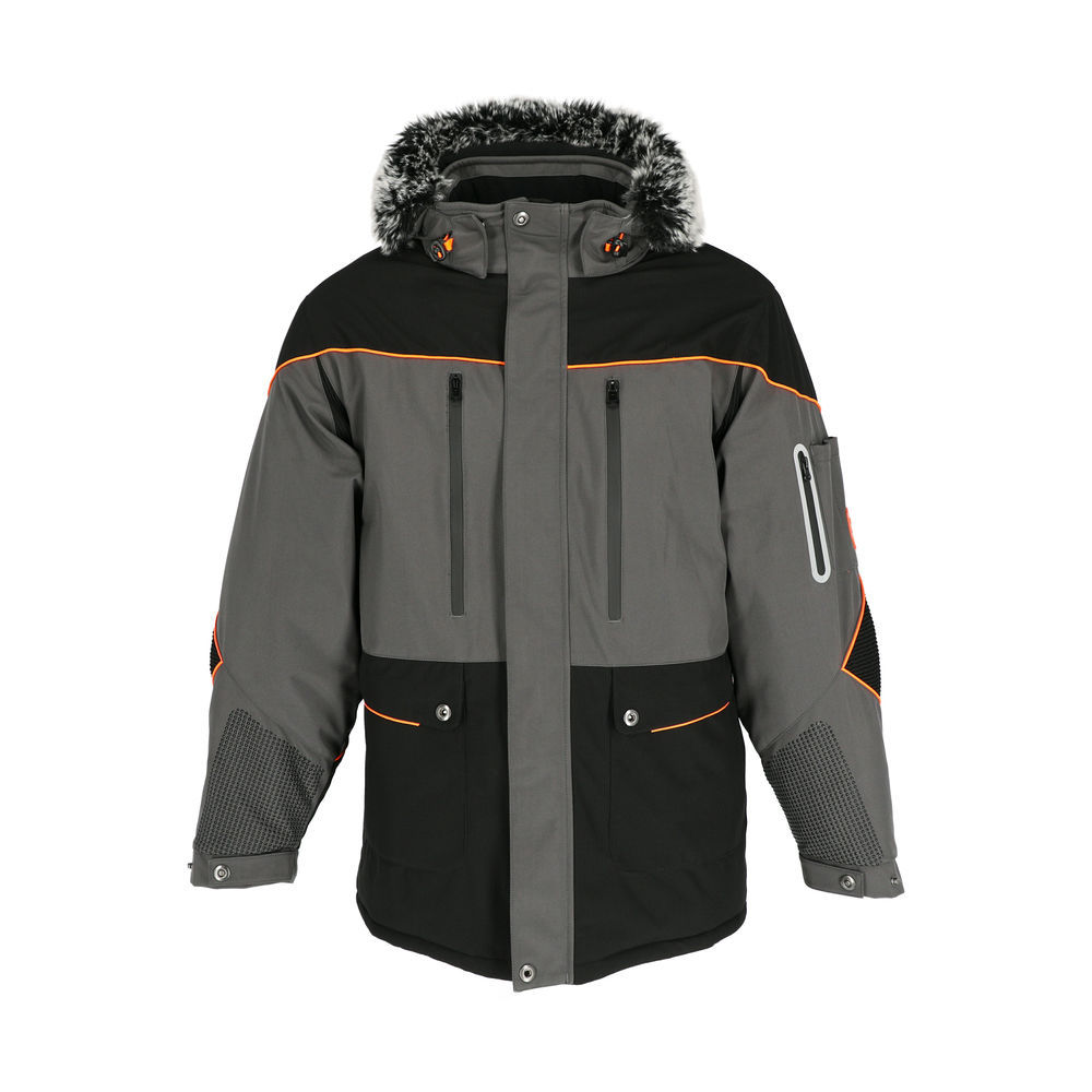 Defy the cold with confidence in the PolarForce Parka, offering lasting warmth and style with a comfort rating of -40°F. This parka goes beyond conventional winter wear, providing extra length in the style to safeguard your vital organs from extreme cold. Customize your protection with the detachable hood and removable faux-fur trim, allowing versatile adaptation to varying conditions. The water-repellent, wind-tight finish of this men's winter jacket ensures you stay shielded from harsh elements. With adjustable outer cuffs, over 500g of insulating power, and a removable hood, this jacket is designed to keep you heated and ready for any task, even in the strongest winds. Tailored for durability, it excels in the toughest work environments, making it ideal for all-day shifts in freezers or outdoor work. The multifunctional design includes 2 large, zippered chest pockets, a sleeve pocket with a waterproof zipper, and a 2-stall pencil pocket on the left sleeve, providing ample space for your essentials. Casual, practical, and durable, the PolarForce Parka is equally suited for work or play, ensuring you stay warm and protected in style. <BR><BR> Your time is precious, so it's important that you have all the right equipment to finish your jobs quickly and efficiently. Finding the right products shouldn’t be hard work. We’ve been with our customers in these cold, tough conditions and know how hard it can be. Not only do you have to do a job, but you have to do it at -40°F. Our gear is tougher than the conditions you face. Tackle any job—and we mean any job—knowing that RefrigiWear will keep you warm, safe, and focused on getting things done.